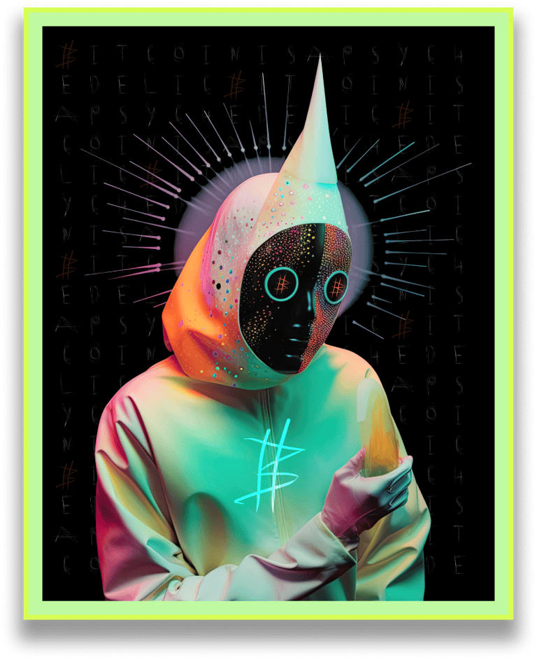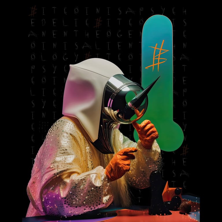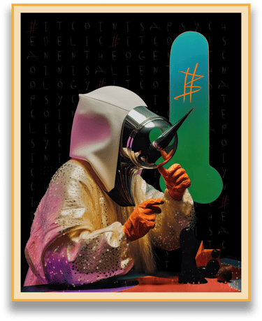 The artist, who is an experienced The artist, who is an experienced entheonaut, exploring different realms of conciousness extensively, takes his experience of the 11th dimensional, non euclidean beings and juxtaposes it with the idea that bitcoin is itself, a psychedelic or even entheogenic experience.